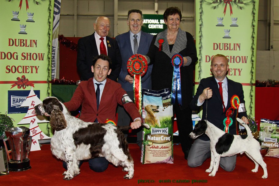Dublin Dog Show Society’s event on 27th December, the last show of the season, was a triumph for the English Springer Spaniel, Ed Casey & Cam Cavallo’s GB Sh Ch & Australian Supreme Ch Sandicam The Look of Love, when he took BIS on his first trip to Ireland. Since his arrival to England from Australia in August, already with 10 all breed BIS and a multitude of other top wins behind him, ‘Noah’ clinched his UK title in double quick time, also taking BIS at South Wales. His win at DDSS was under Gundog specialist Angela Hancock, seen here with the host club’s Chairman, Barry Keely, Jackie Stubbs of sponsor, Happy Dog, and Ross Delmar with his and breeder Ewa Lunden’s Smooth Fox Terrier, Ch, Swe, Nor, Dan, Nordic & Int Ch Residentsets Stand-In, who was Reserve BIS and is Ireland’s IKC Dog of the Year 2016, courtesy of his BIS and RBIS wins during the year.