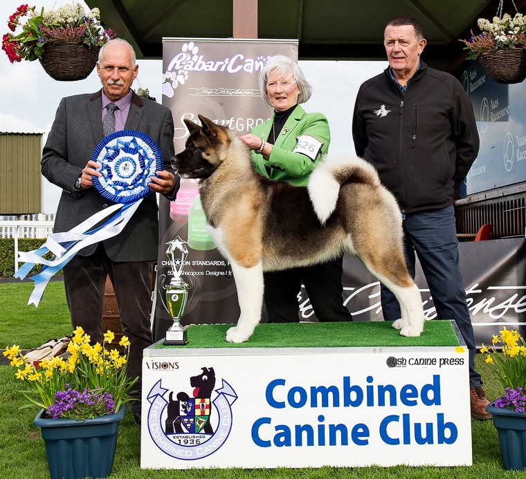 ‘I like the way you walk’ in the words of the Suzie Quatro song, must have been one of many things on the mind of Combined Canine Club International Best in Show judge, Eytan Hendel, when he judged the last ten dogs, finally handing the big rosette to a delighted Ellen O’Neill for her American Akita, GB Ch Geilsaven Suzie Que, on Easter Saturday ’23. This home bred girl, just three and a half years old, and named for Suzie Quatro, has packed a lot into her short career, having missed many shows due to the covid break, but she has already won 8 CCs with 4 Reserve CCs. Top CC winning bitch in the UK last year, she was No.1 Akita in her native Scotland, won Top Scottish Open Show Dog of 2022 and finished 4th overall in the Scottish All Breeds Showdog of the year ’22. Sired by Ch & GB Ch Melador All Hell Broke Loose CW 17 and Ch Geilsaven Love and Kisses, her litter brother, GB Ch G. Diddley Bo, another rock ‘n roller, had taken the RGS & CACIB and his lyrical daughter, G. Toote Sweet, was Reserve GS & CACIB behind Suzie, so quite a family affair under breed judge Denis Kuzelj. Suzie had earlier won the Group under Juan Naveda Carrero, much experienced All Breeds judge from Spain, before she hit the high notes in the main ring, taking her first International All Breeds Best in Show.