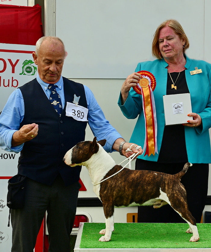 Wojciechowski’s Miniature Bull Terrier, handled in Ireland by breeder Ger Cox,Ch Coxgal Erin Go Bragh